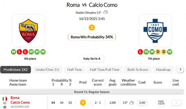 在联赛两队以往的交锋中,罗马在4次对阵科莫的比赛中两次获胜。